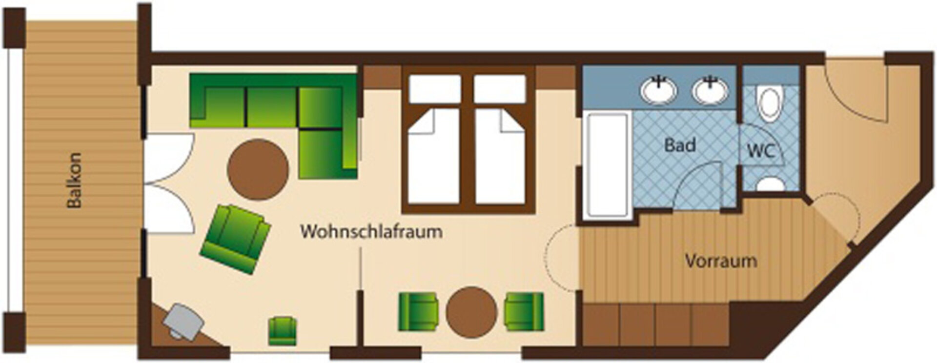 - Kombinierter Wohn-/ Schlafraum durch eine Schiebetüre abtrennbar, mit Doppelbett, ausziehbarer Kuschelcouch und Sitzecke