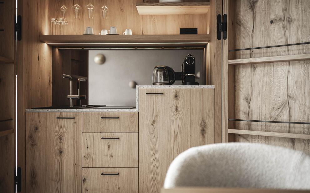 - Eine kleine Kitchenette mit Kühlschrank, Herdplatte und Kaffeestation