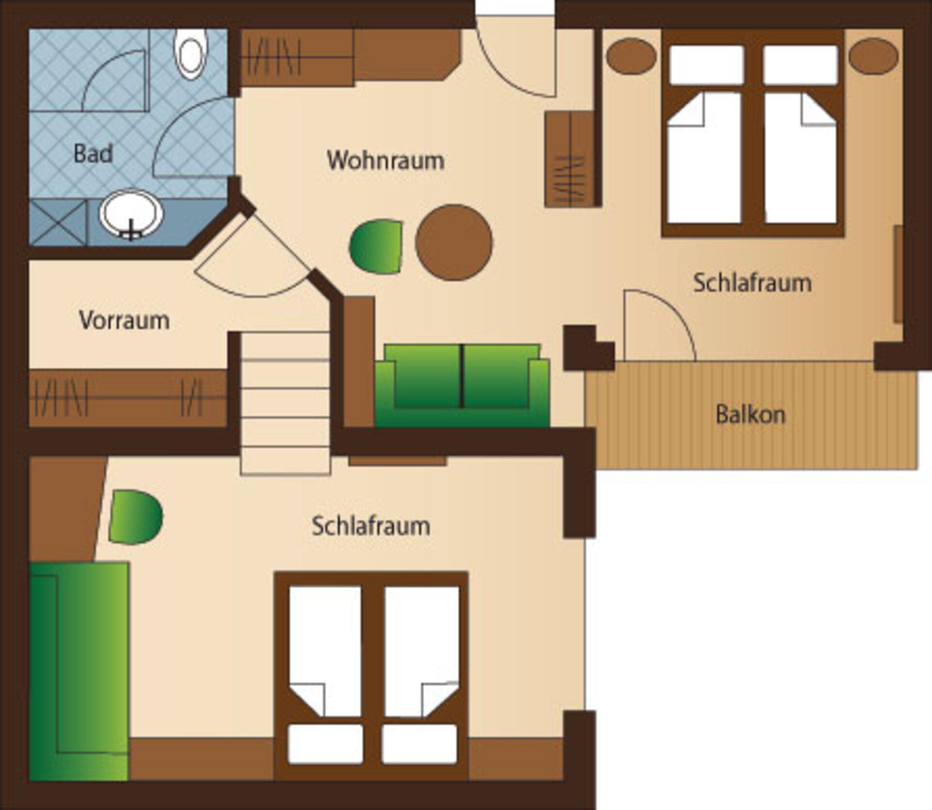 - wooden floor in the living room and bedroom and carpeted floor on the stairs